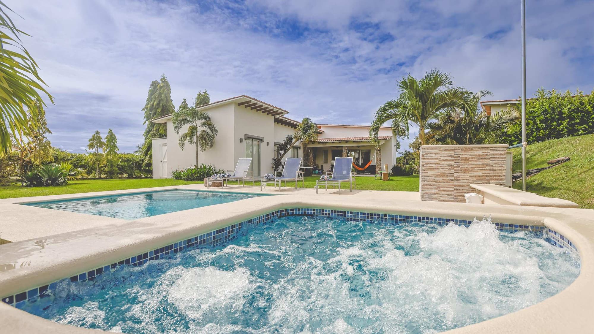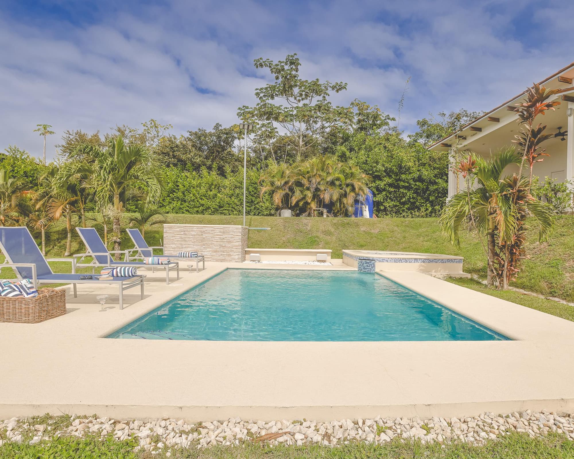 Piscina privada: Disfruta de una refrescante piscina rodeada de jardines tropicales, perfecta para relajarse durante el día o la noche.